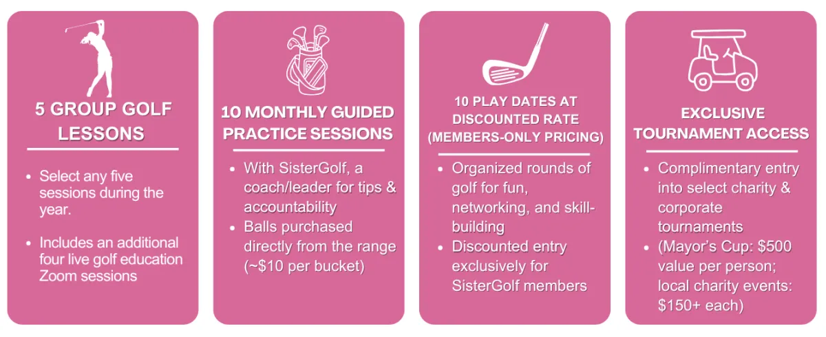 Discounted Rate on all SisterGolf Sponsored Events: Exclusive events' priority invitations, discounted access to golf events and tournaments, and discount on 4 free 30-minute one-on-one Zoom calls with Shella to answer any golf questions and provide advice on how to move forward in your golf journey